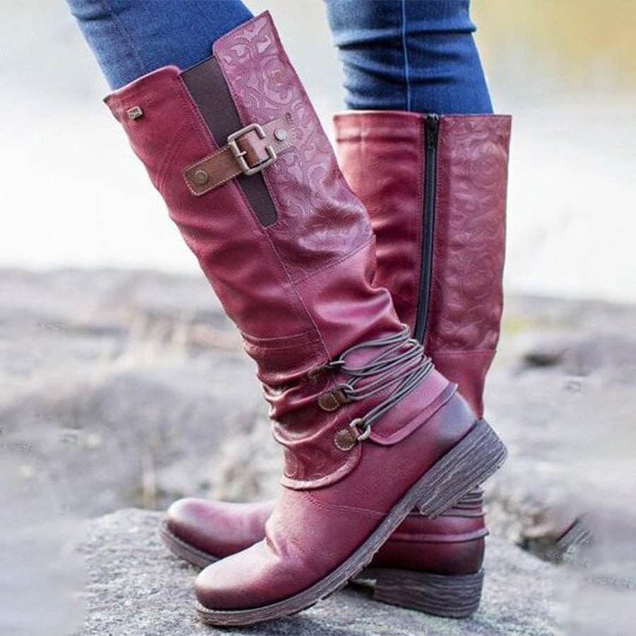 Women's Western Round Toe Square Heel Buckle Knight Boots